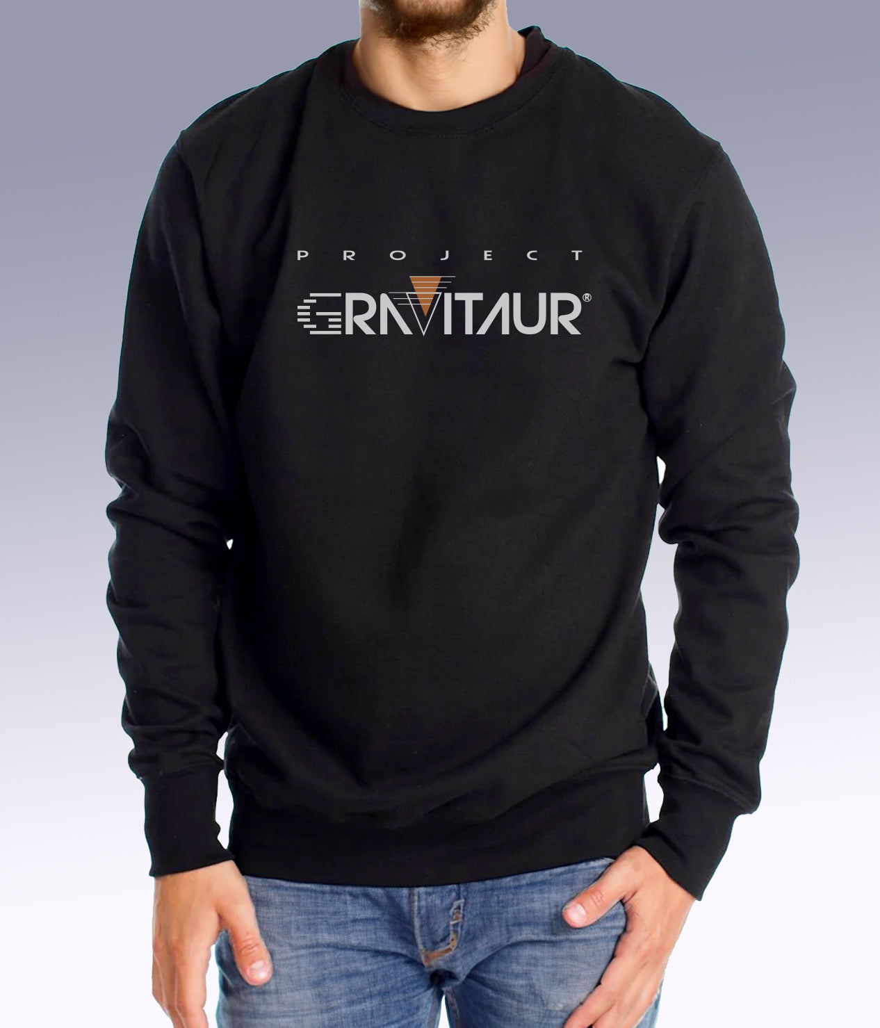 Long sleeve black crewneck sweater printed with the Project Gravitaur logo