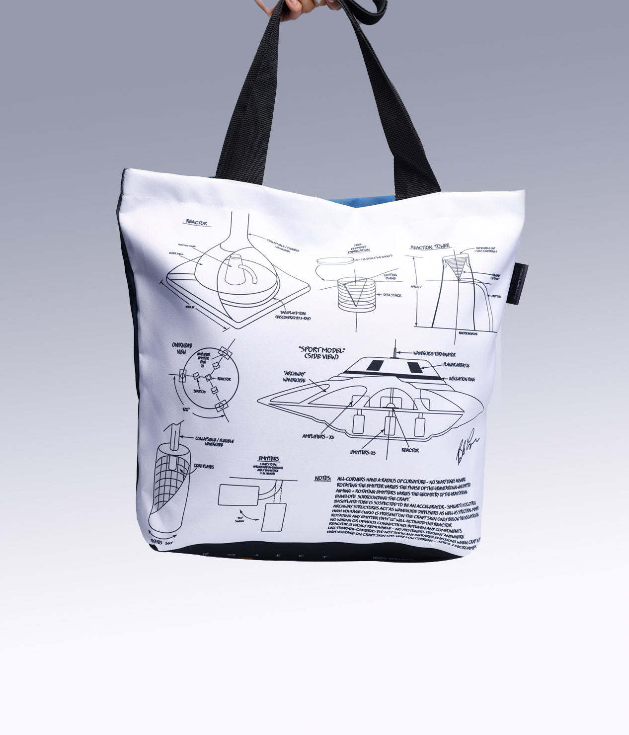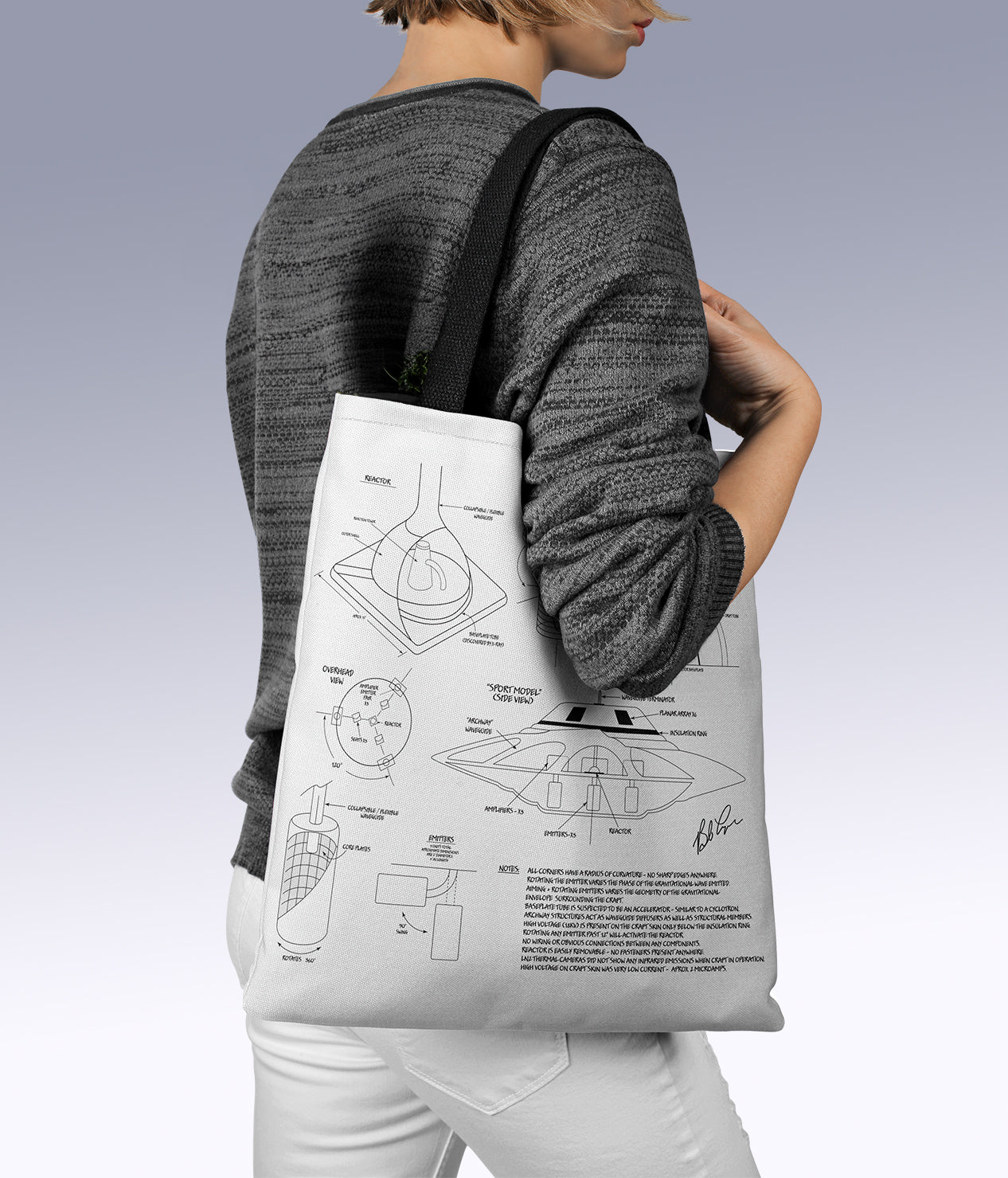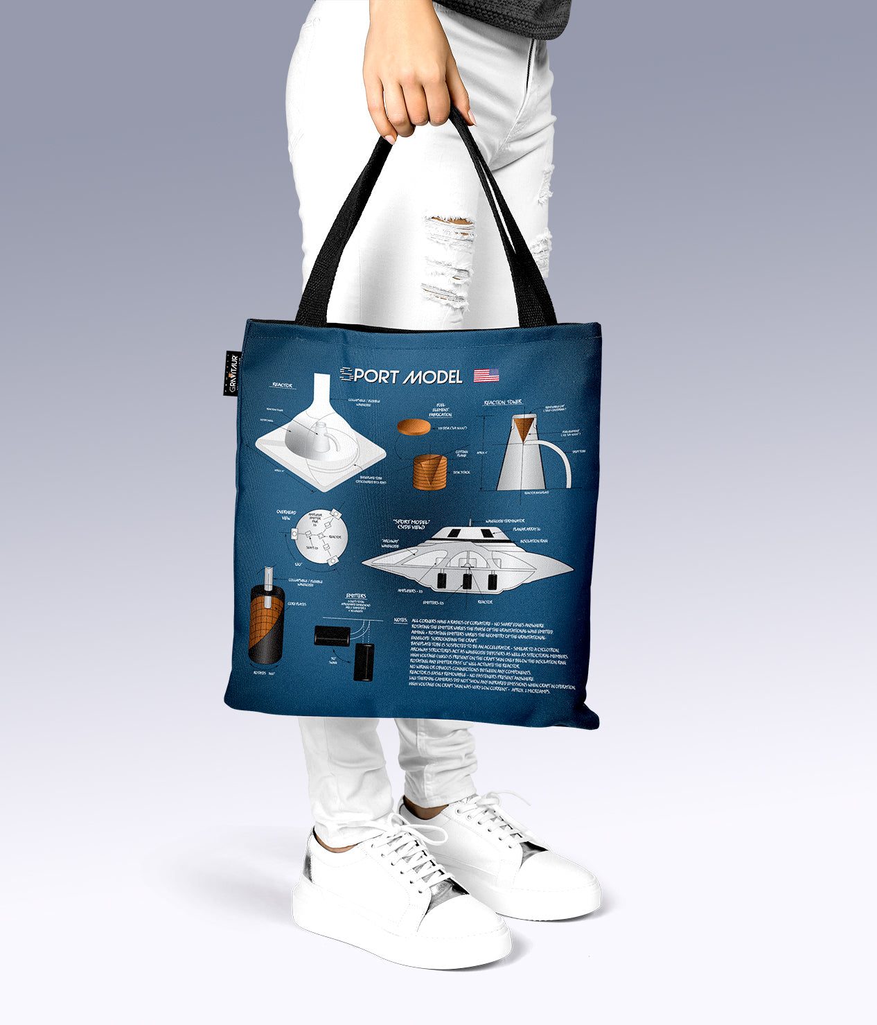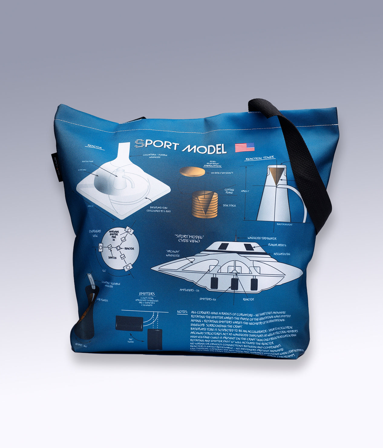 Water resistant canvas bag with black interior finish printed with a sketch of the Sport Model craft as explained by Bob Lazar